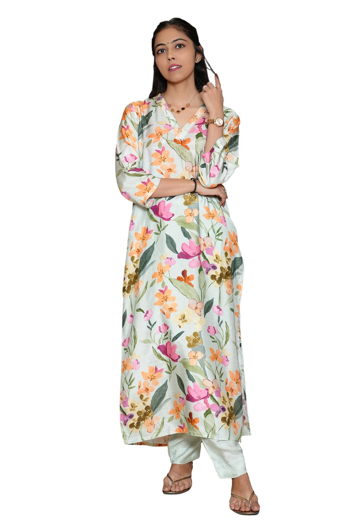 KURTI : LAVENDER COLOR MUSLIN FLORAL PRINTED KURTI WITH TURN COLLAR NECK AND SEQUENCE, THREAD PATTERN AT NECK AND YOKE.