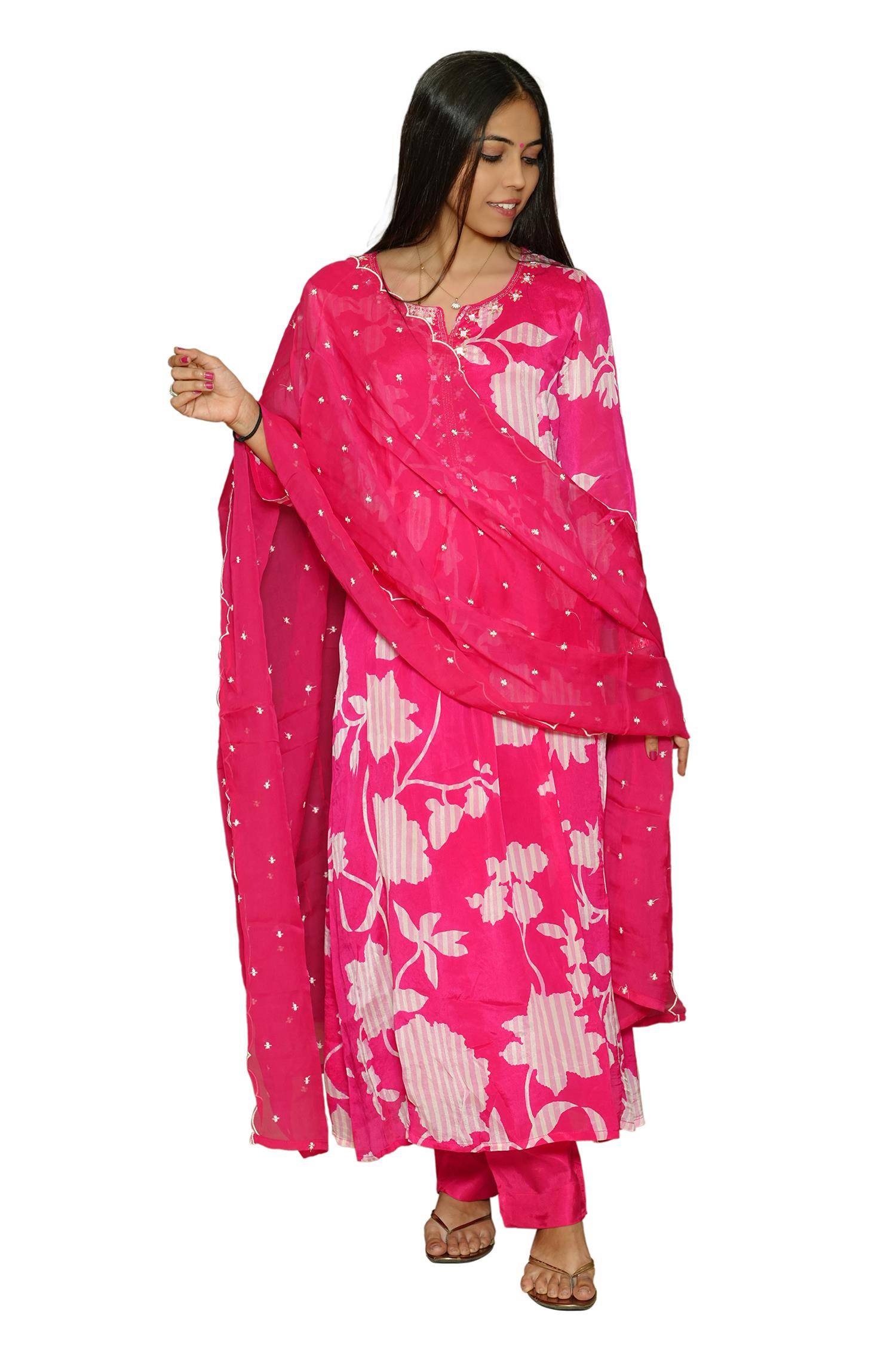 KURTI : PINK COLOR CHINON SILK PRINTED FROCK STYLE KURTI(MUL LINING) WITH PRINCESS CUT, PLEATS IN CENTRE AND REAL MIRROR, SEQUENCE, MOTI AND JARI THREAD WORK AT NECK AND YOKE.
